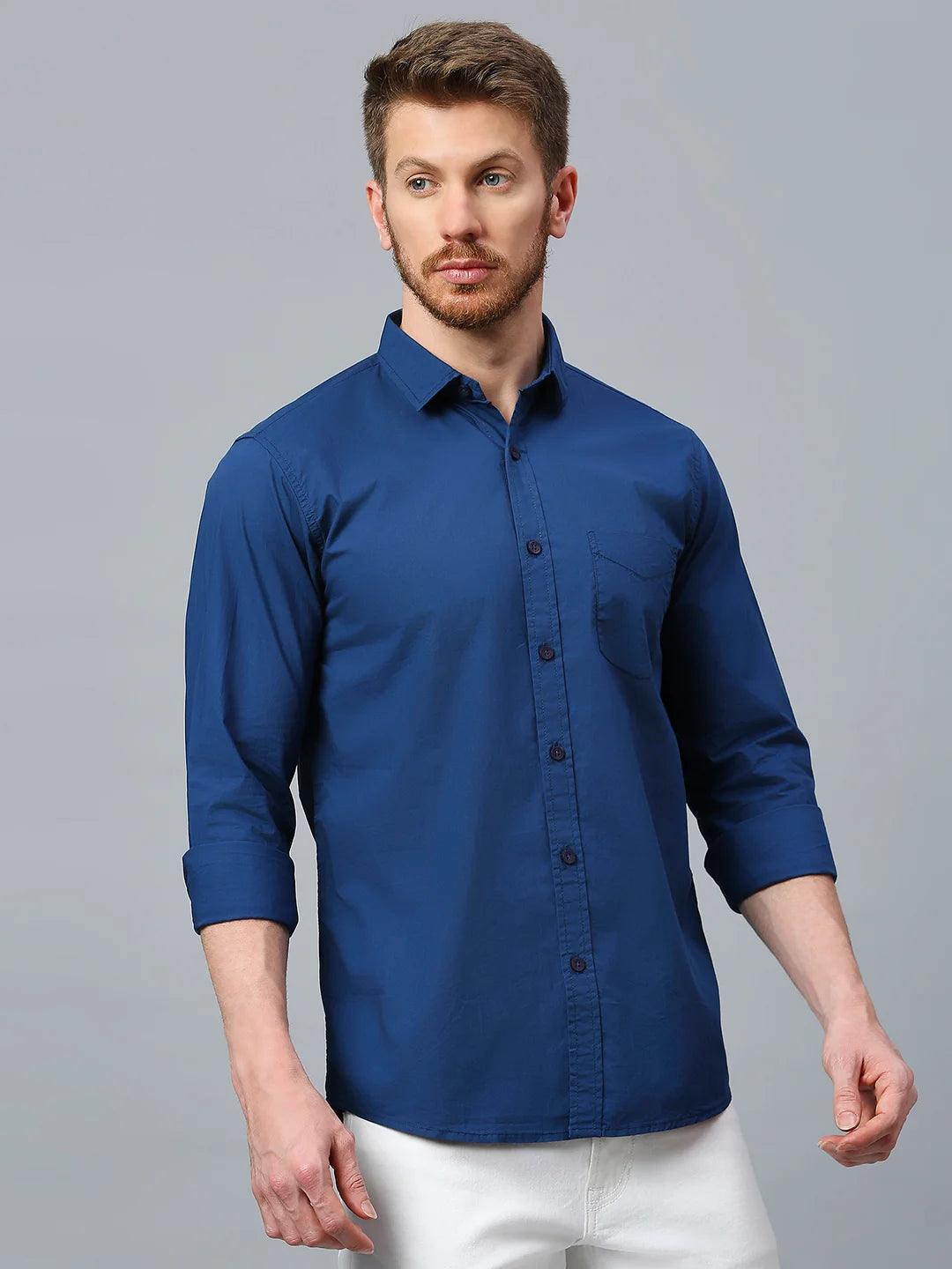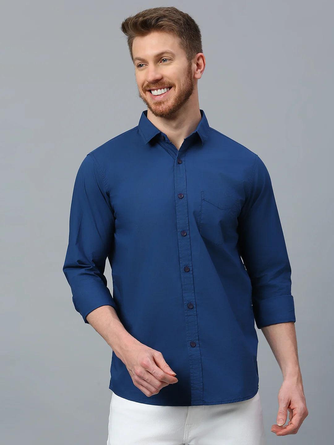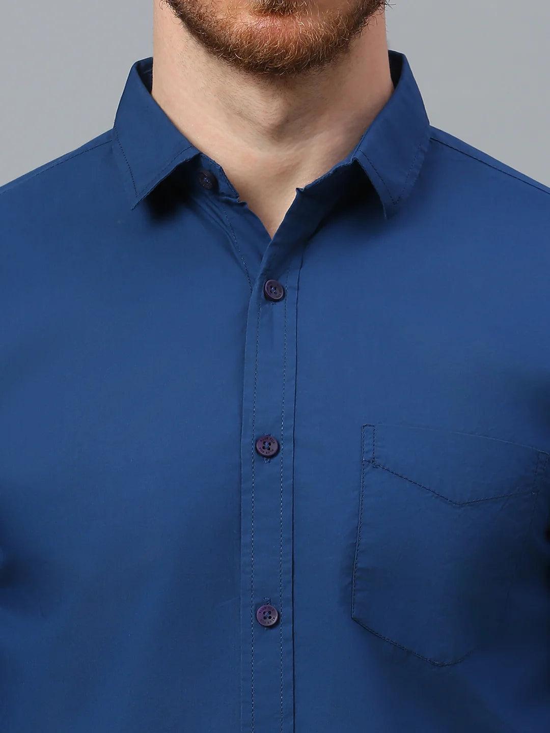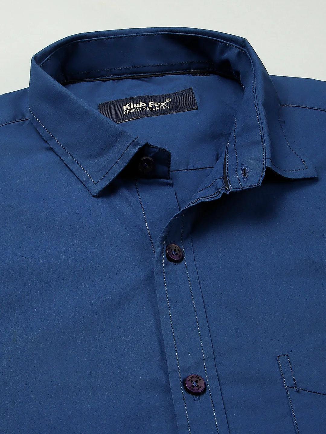 Solid opaque casual shirt has a spread collar, french placket, short regular sleeves, curved hem.
