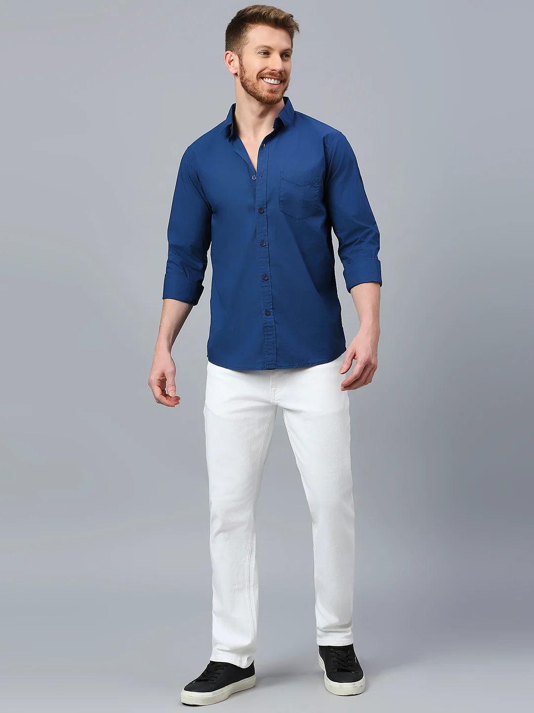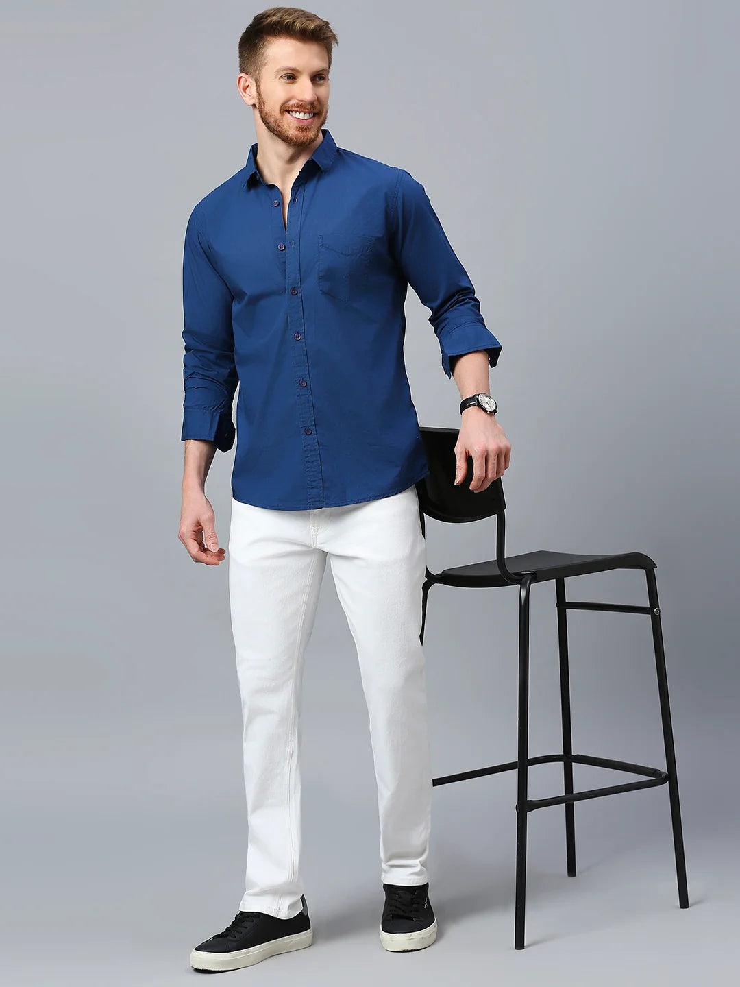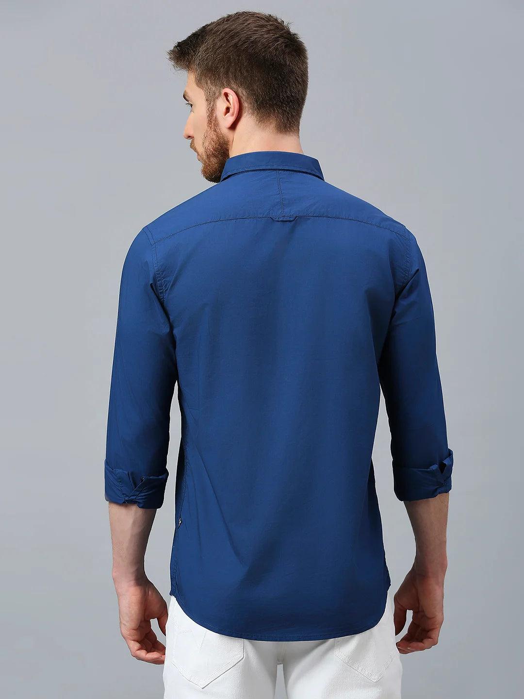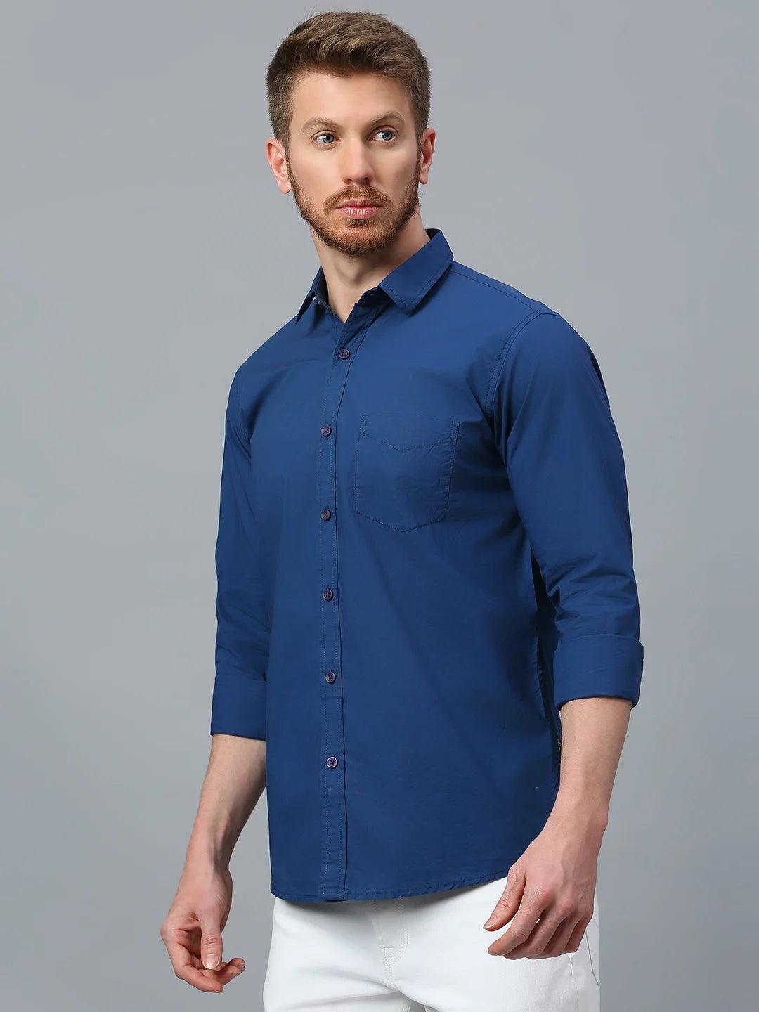 Solid opaque casual shirt has a spread collar, french placket, short regular sleeves, curved hem.