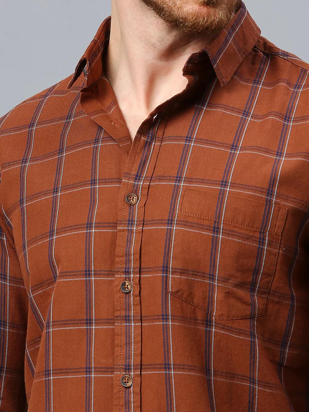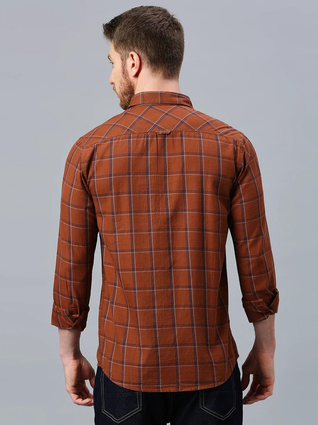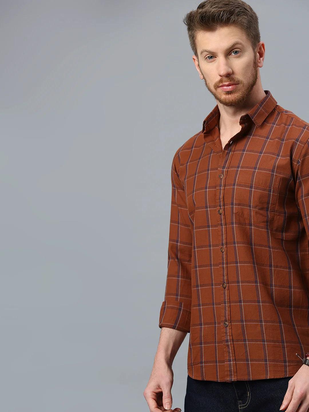Checked opaque casual shirt has a spread collar, button placket, long regular sleeves, curved hem.