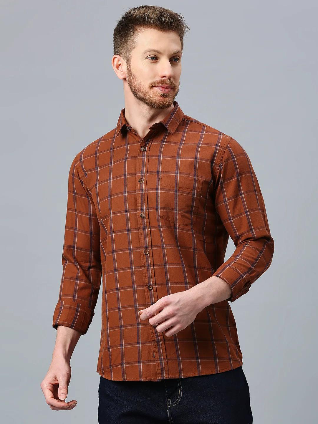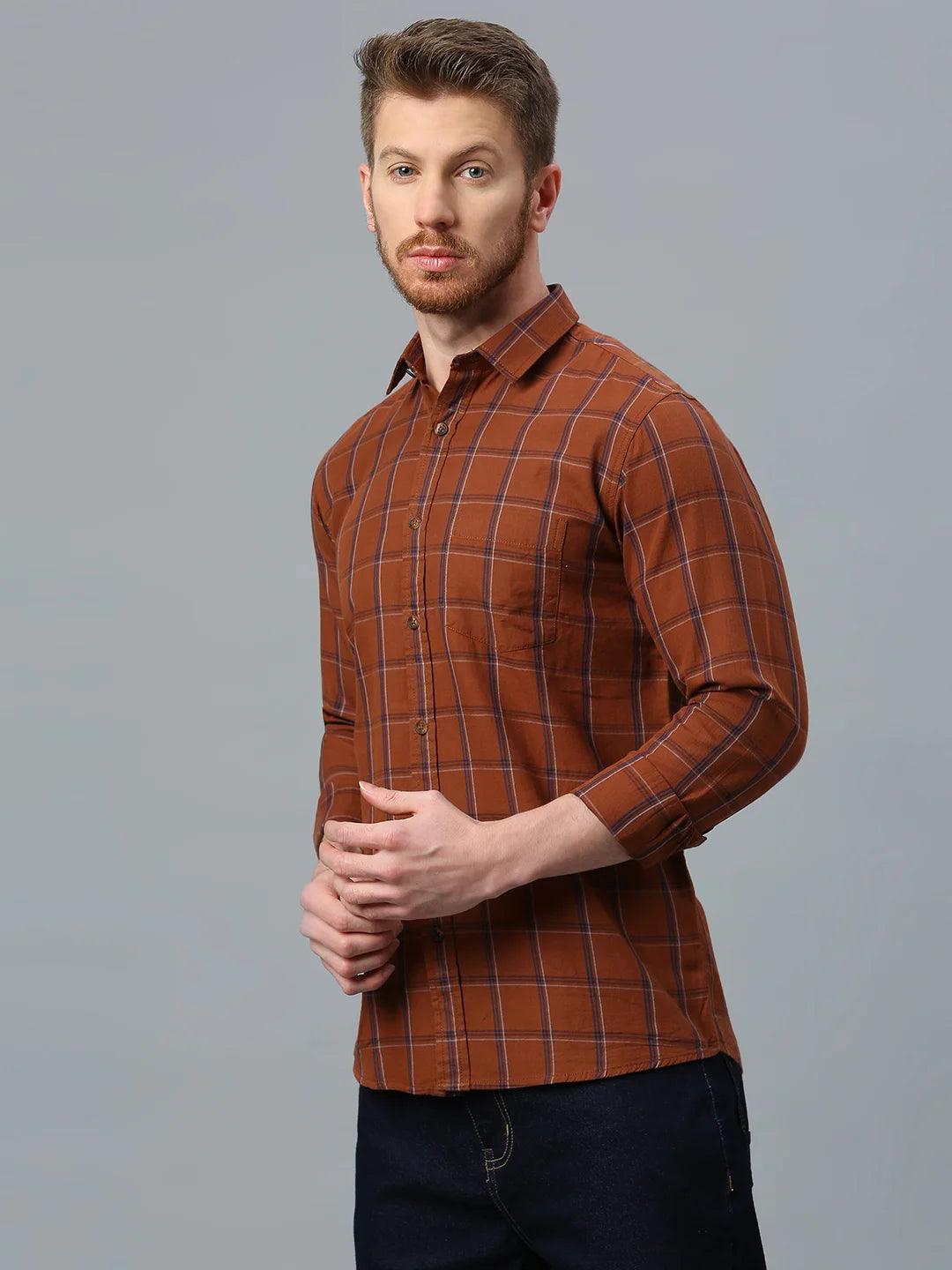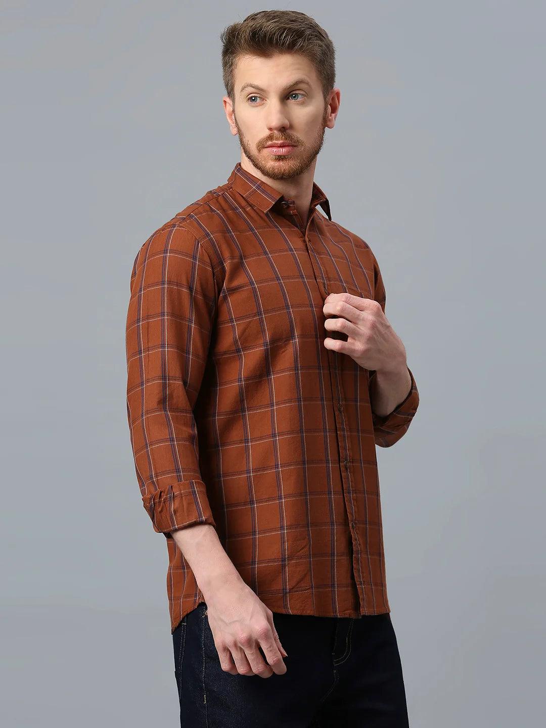 Checked opaque casual shirt has a spread collar, button placket, long regular sleeves, curved hem.