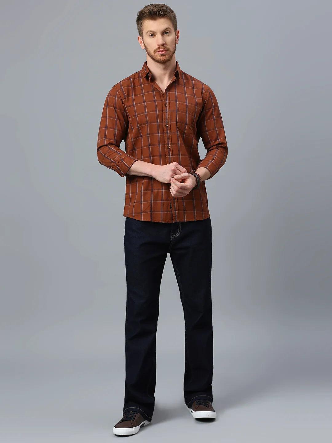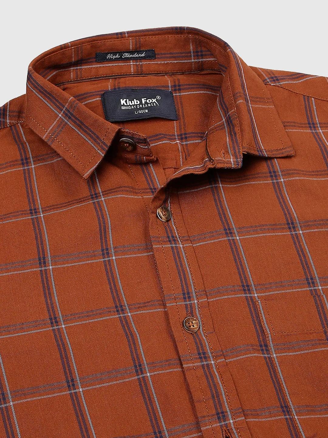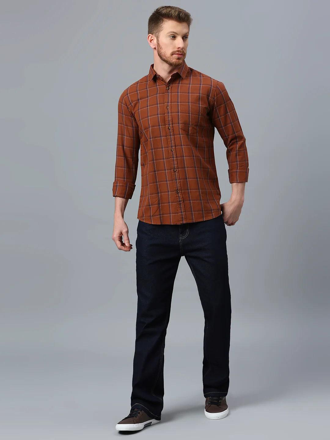 Checked opaque casual shirt has a spread collar, button placket, long regular sleeves, curved hem.