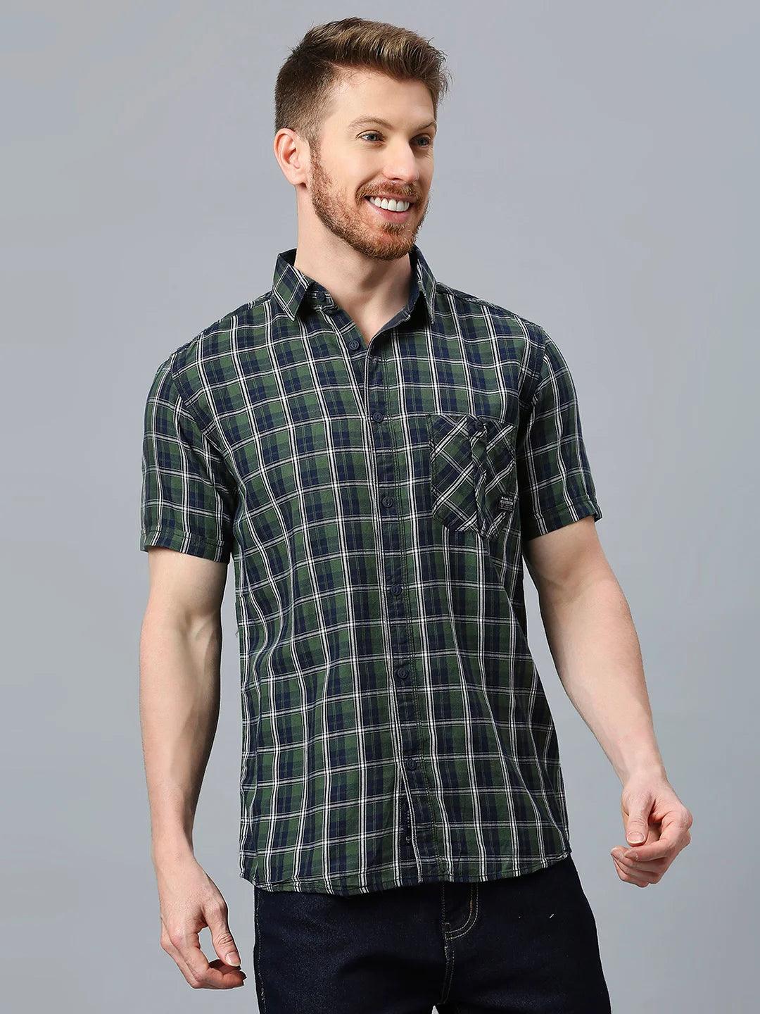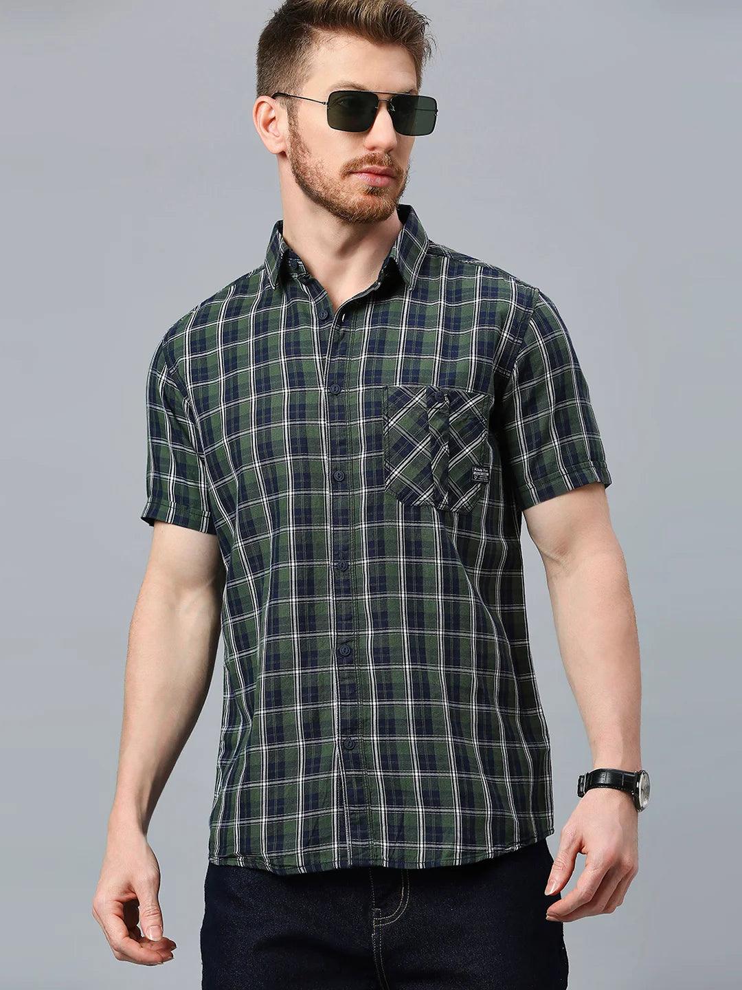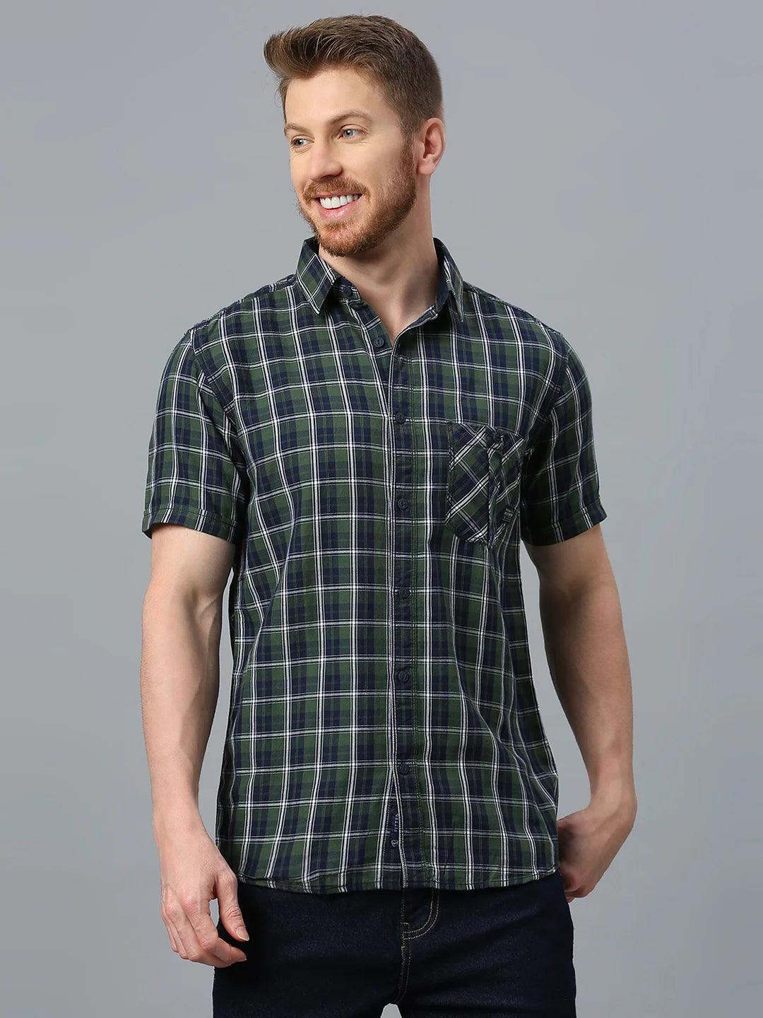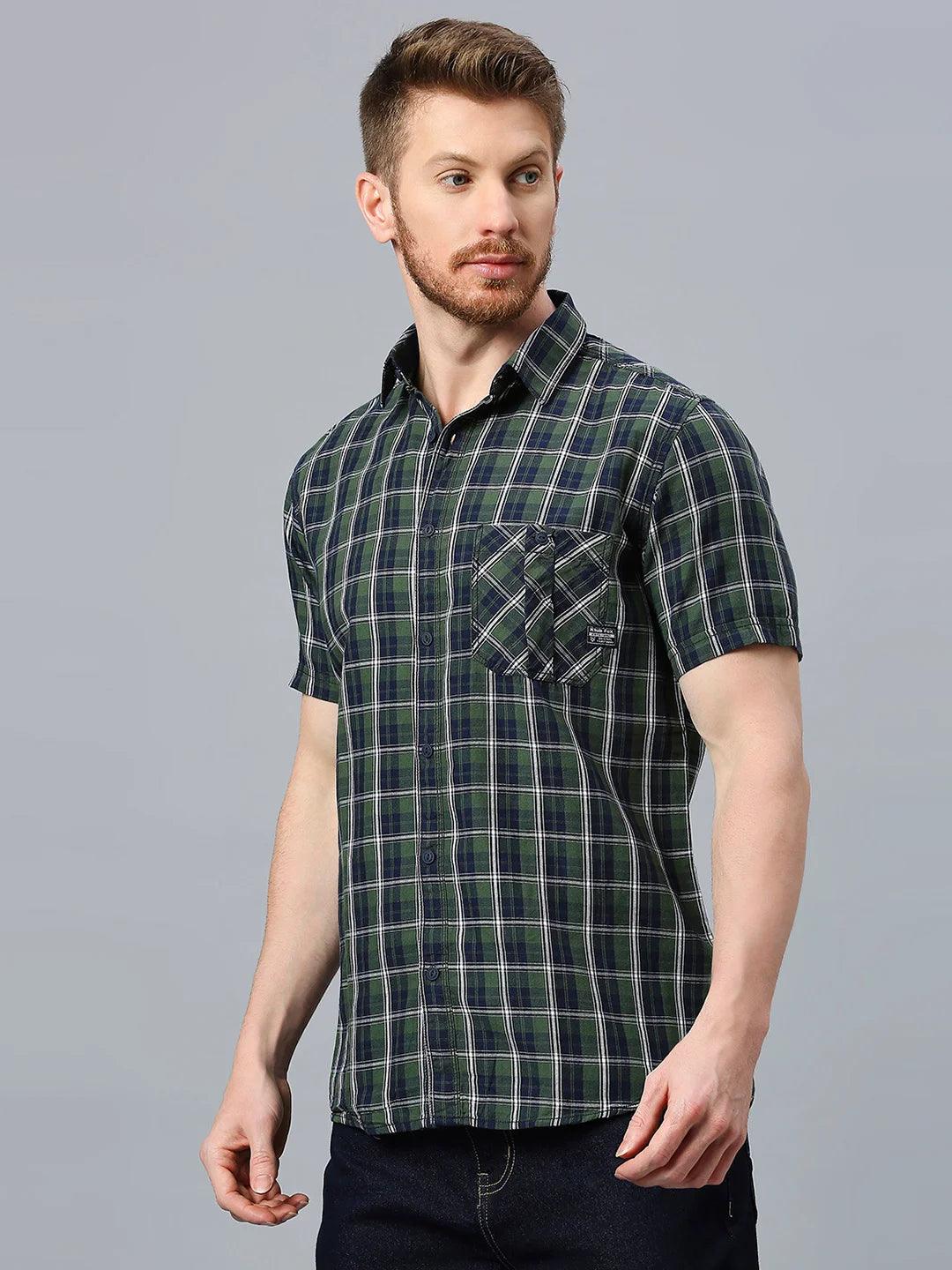 Checked opaque casual shirt has a spread collar, button placket, short regular sleeves, curved hem.