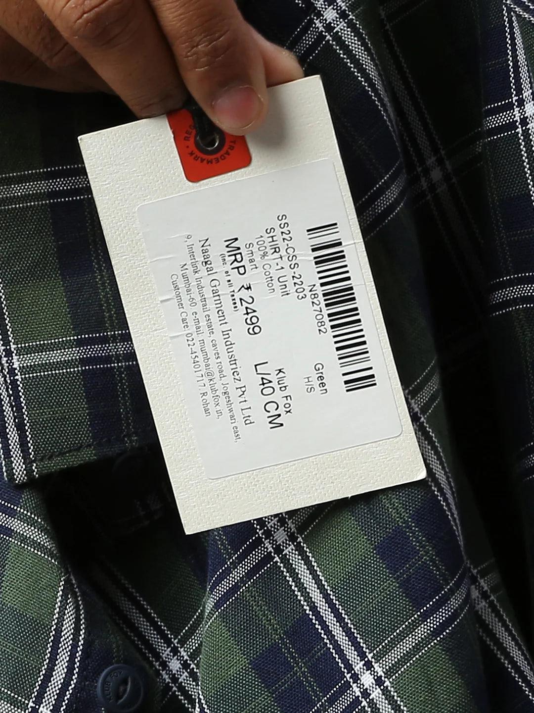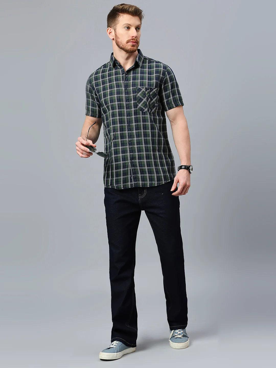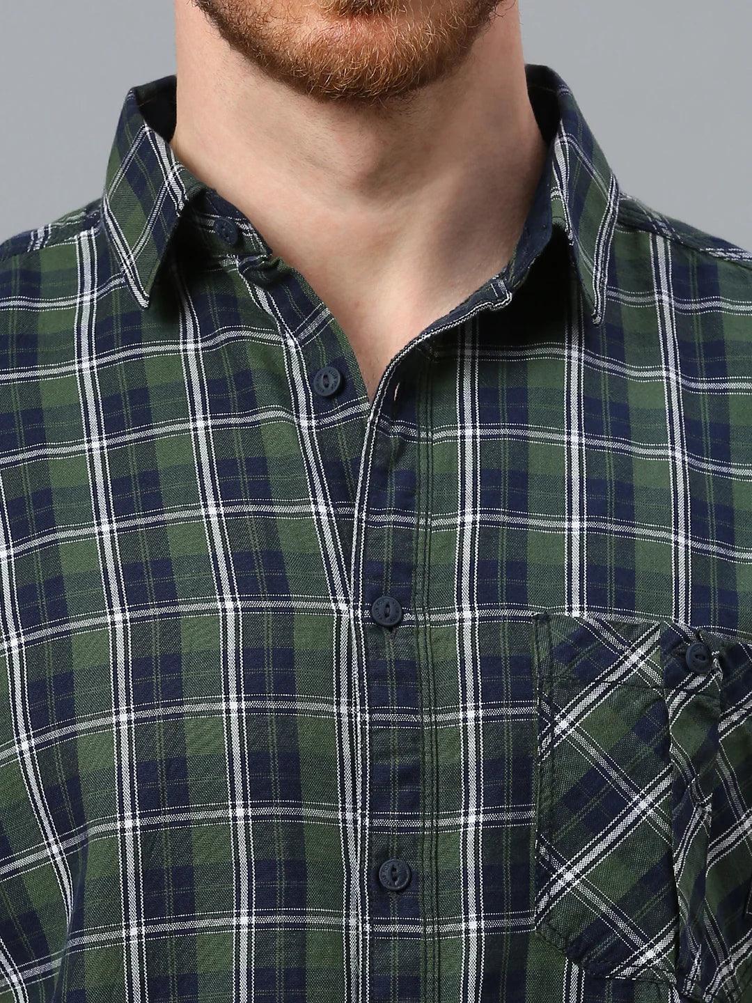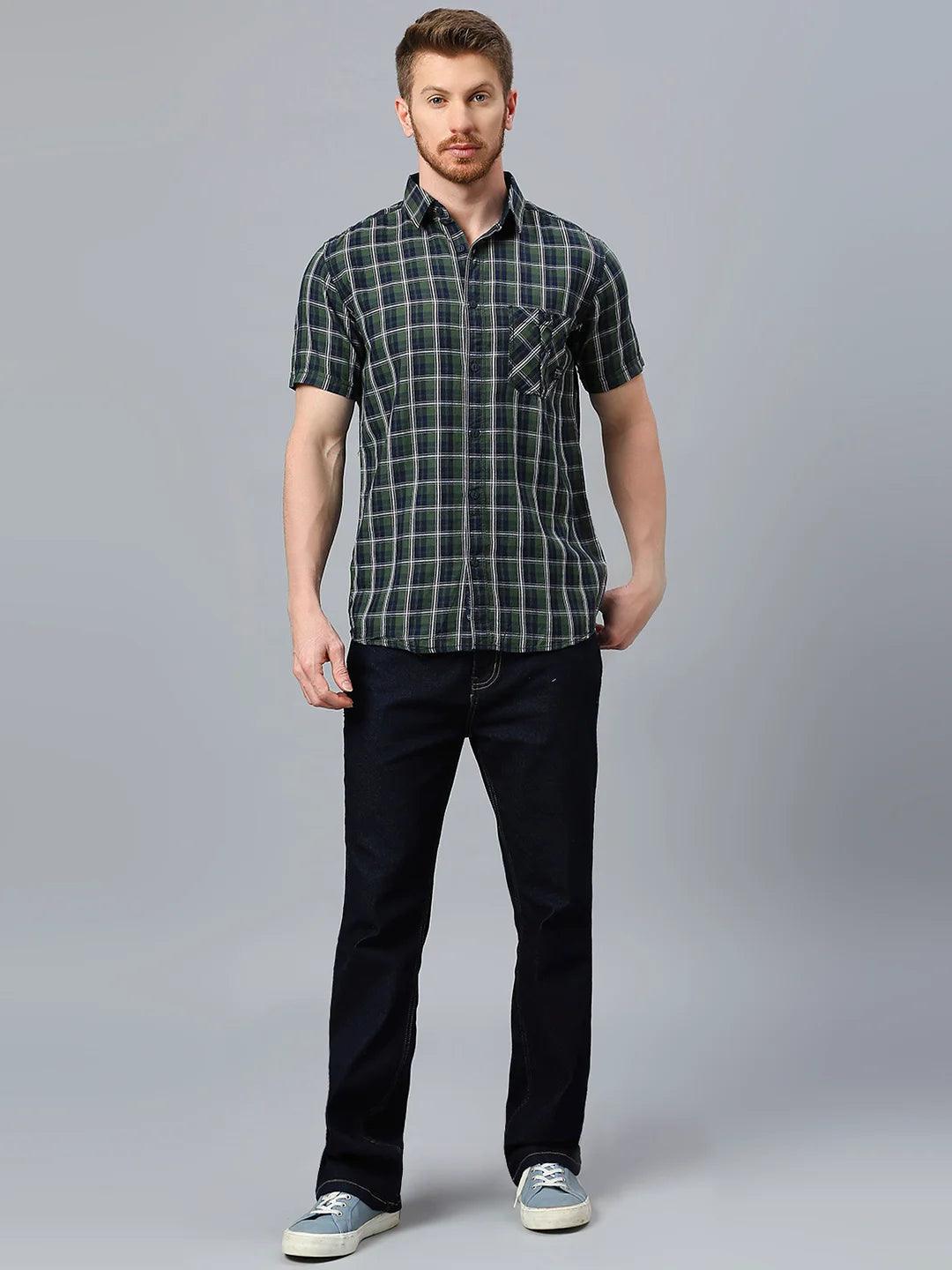 Checked opaque casual shirt has a spread collar, button placket, short regular sleeves, curved hem.