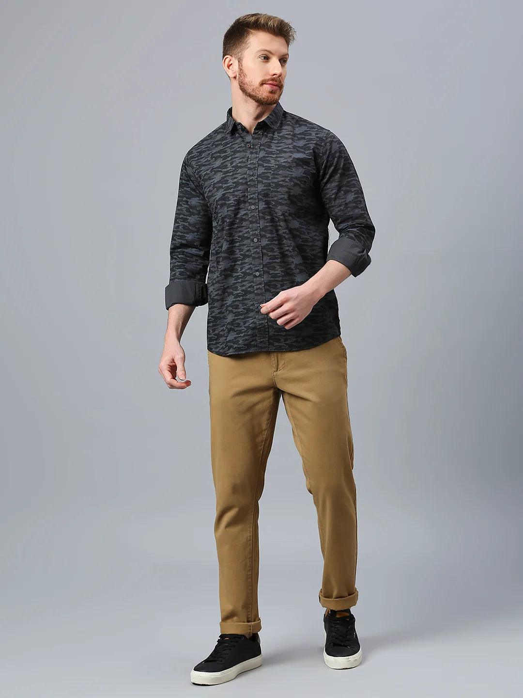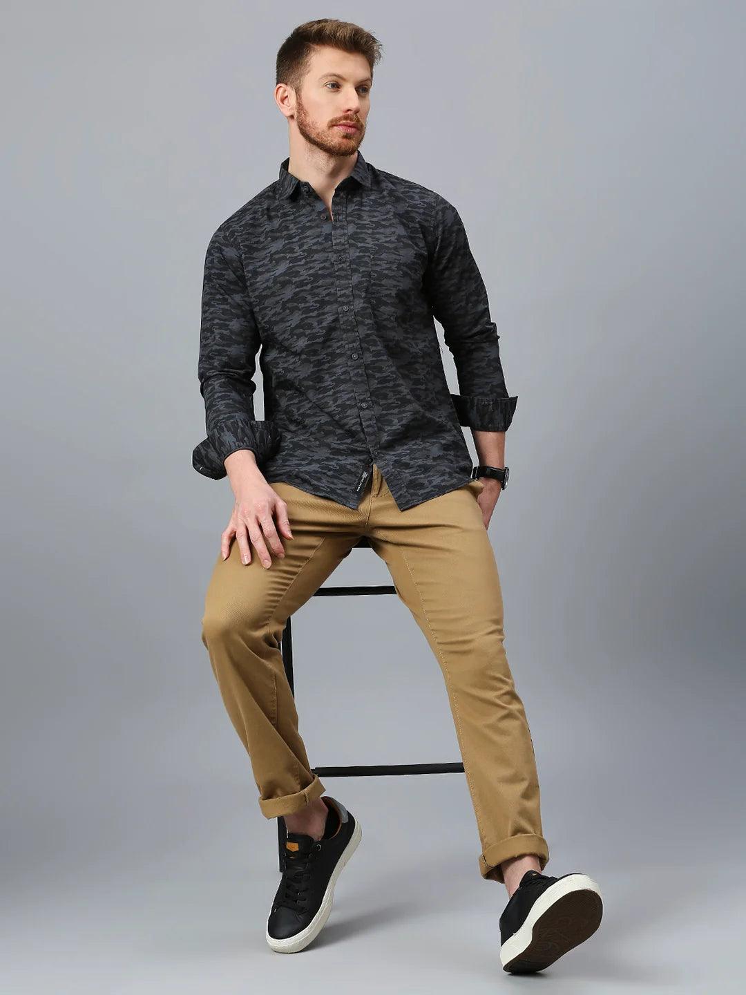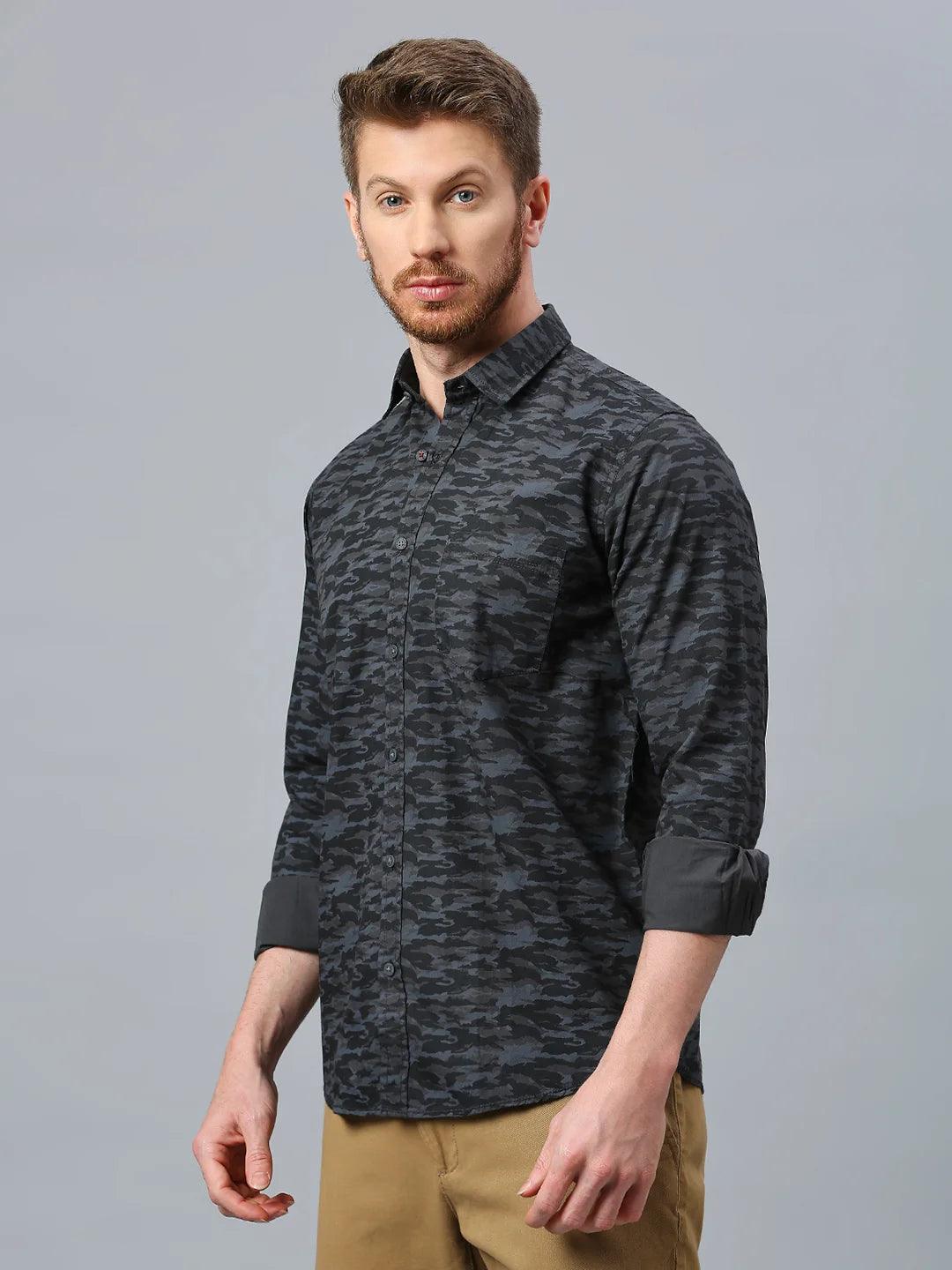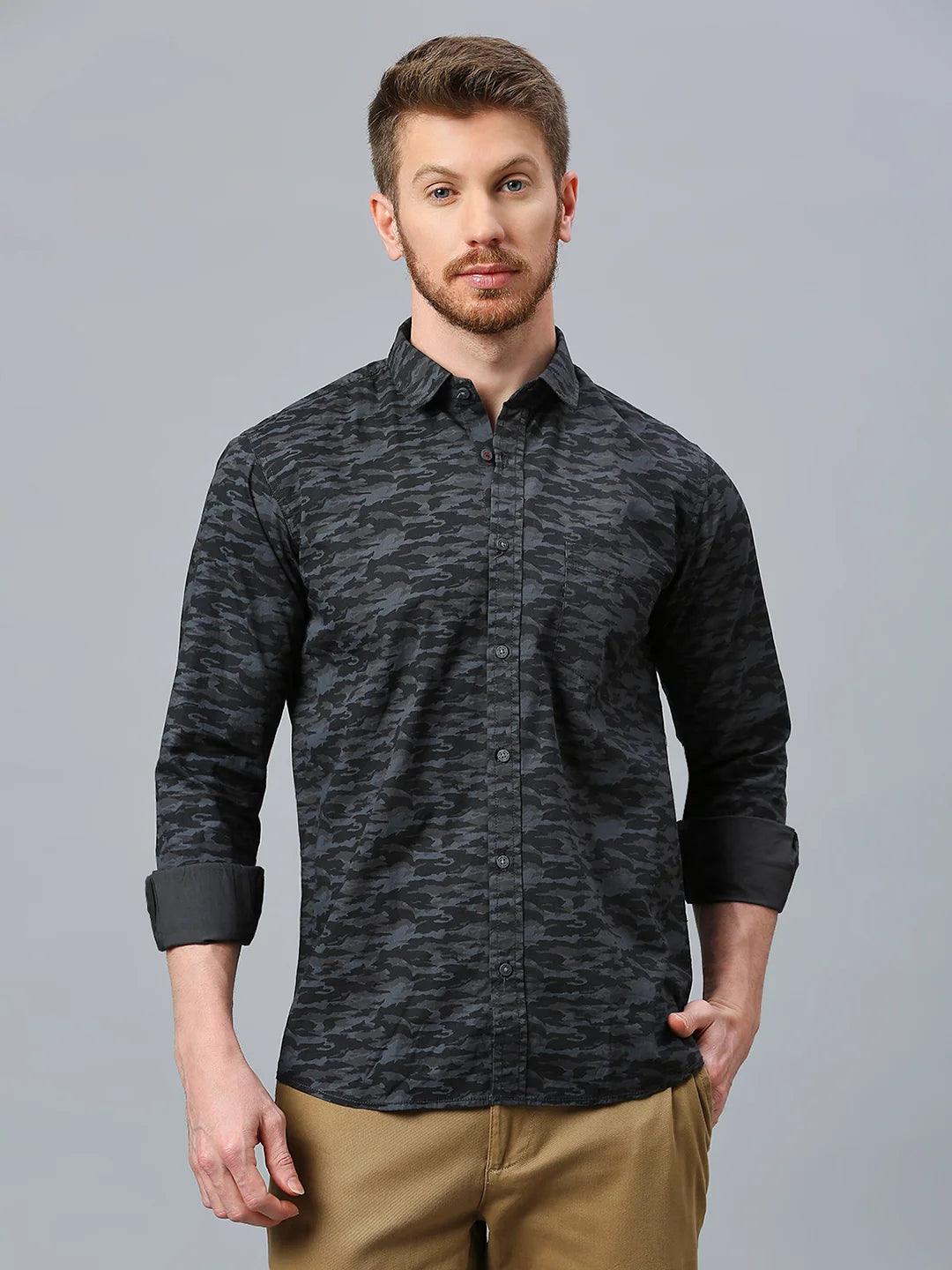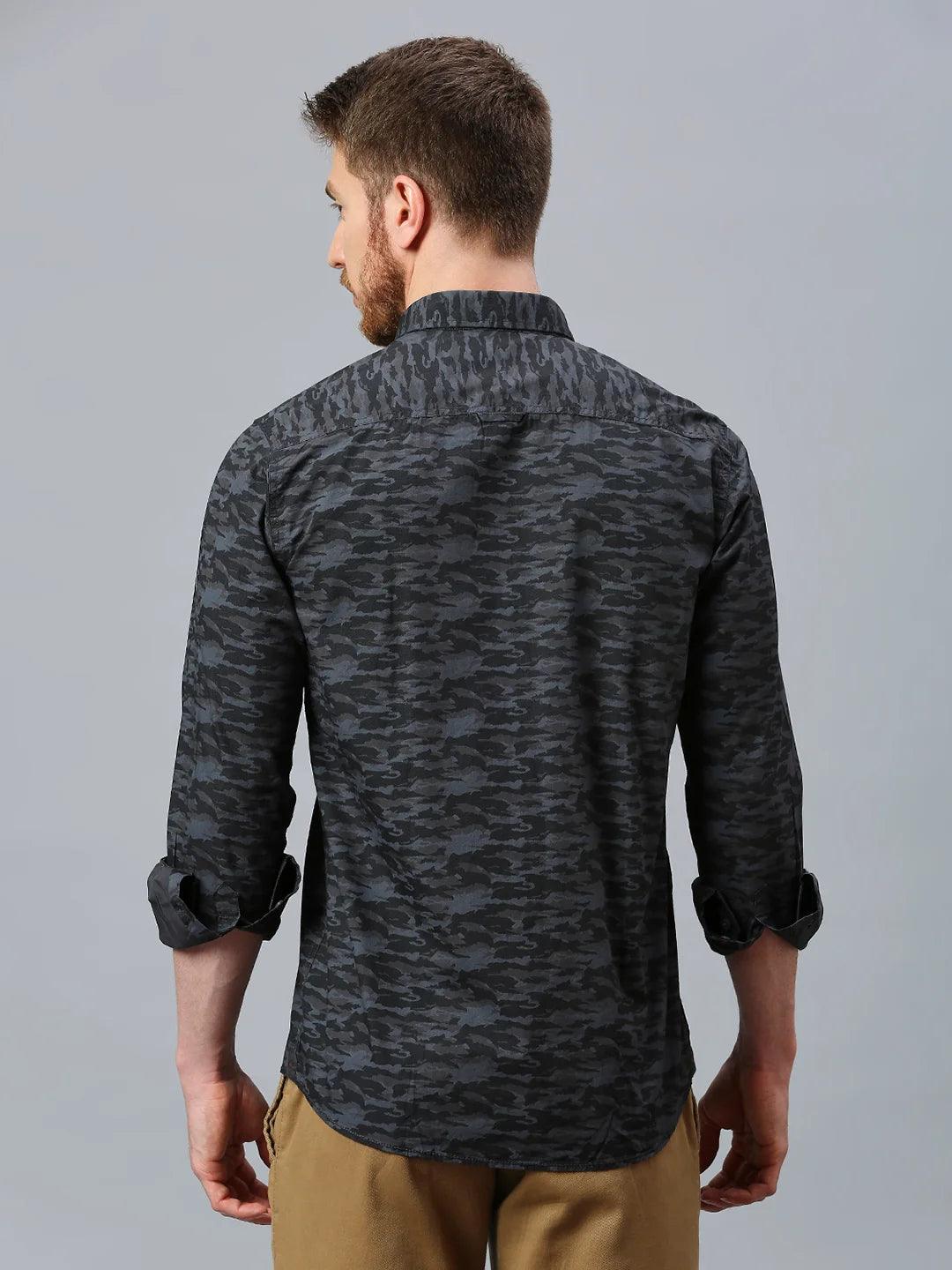 Printed opaque casual shirt has a spread collar, button placket, short regular sleeves, curved hem.