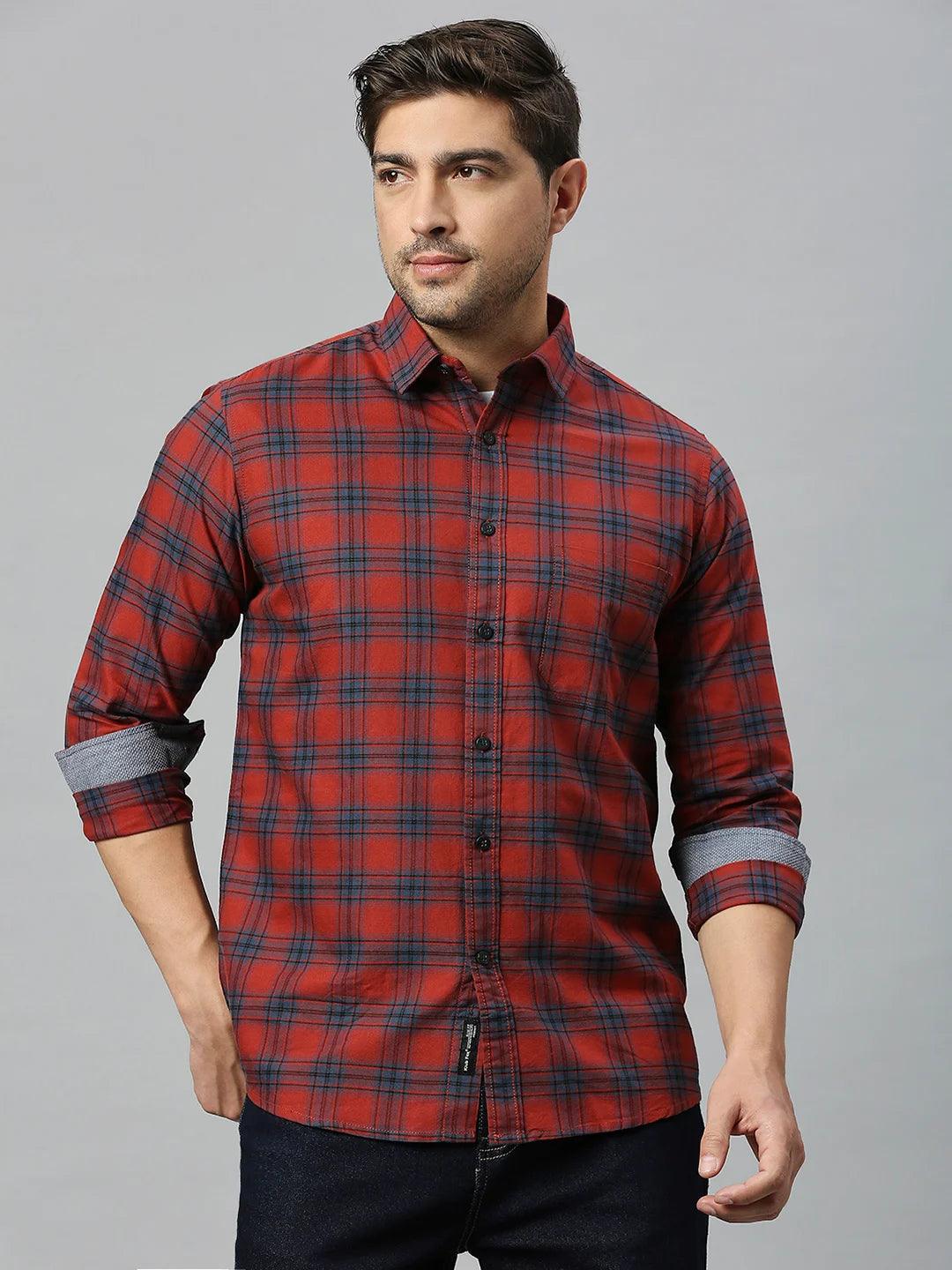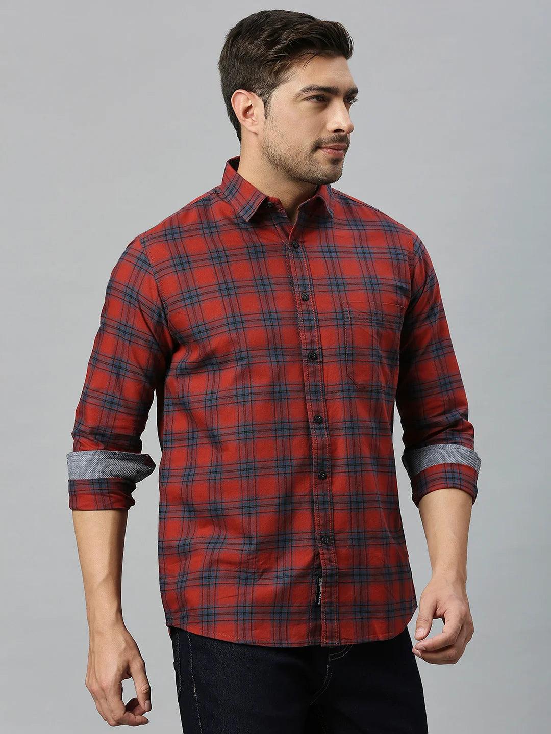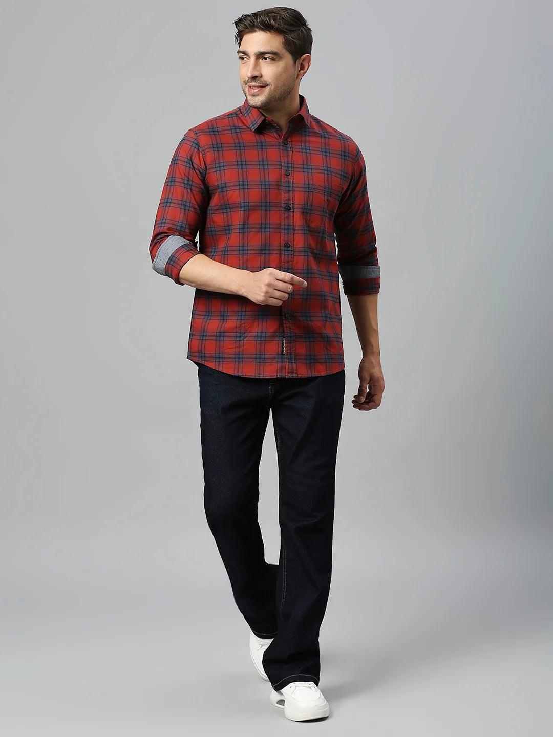 Checked opaque casual shirt has a spread collar, button placket, long regular sleeves, curved hem.