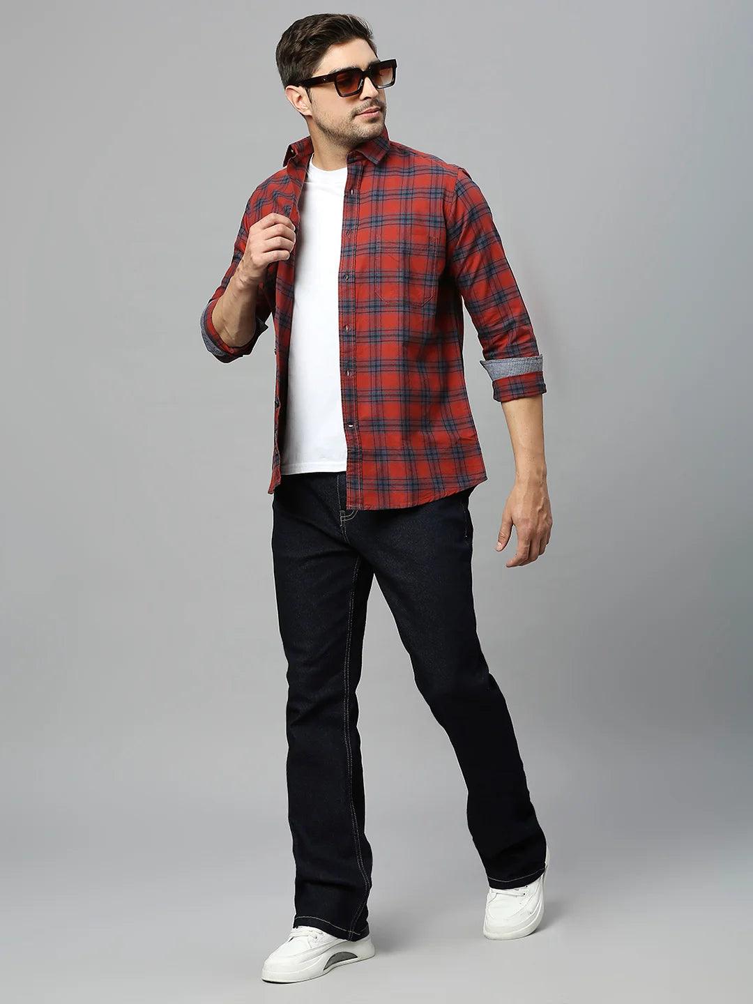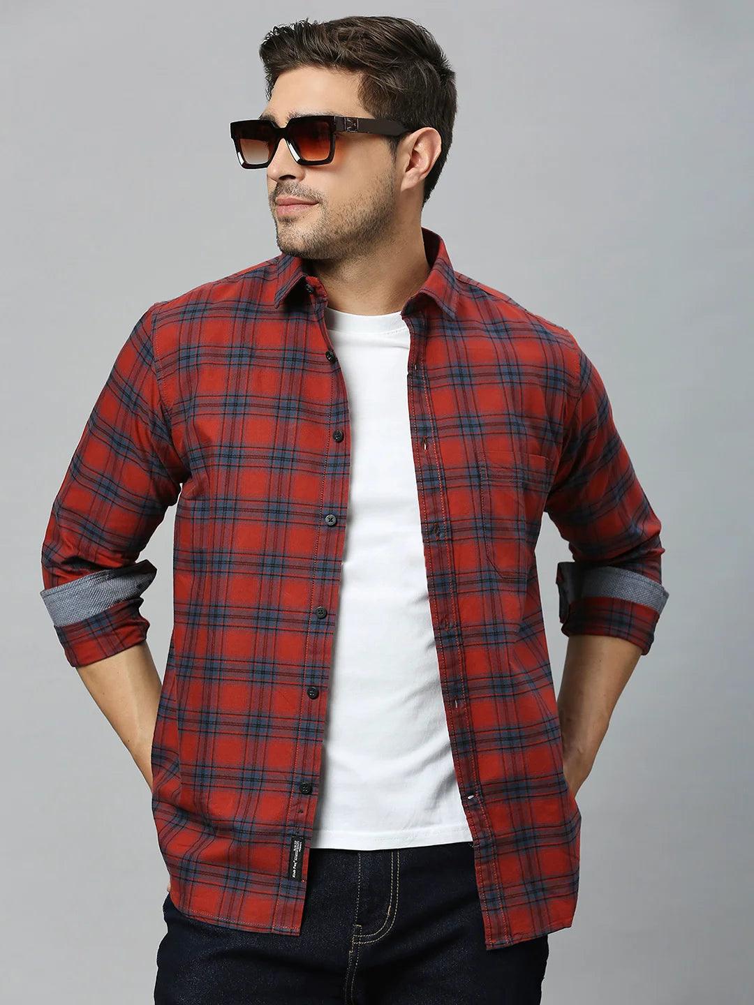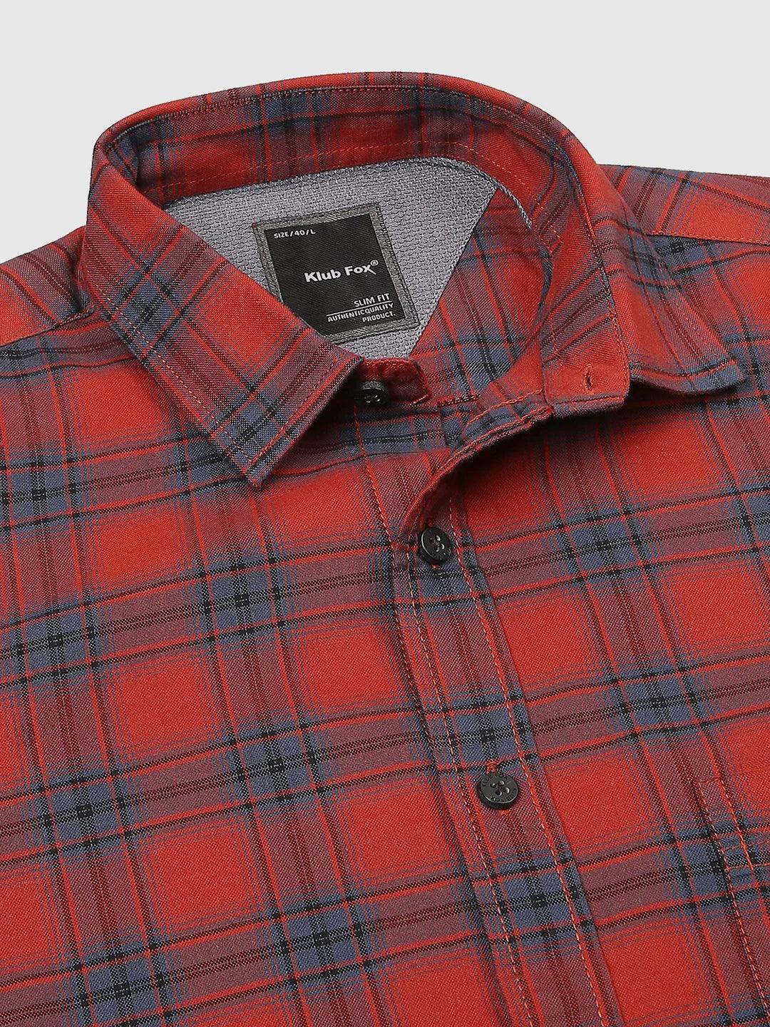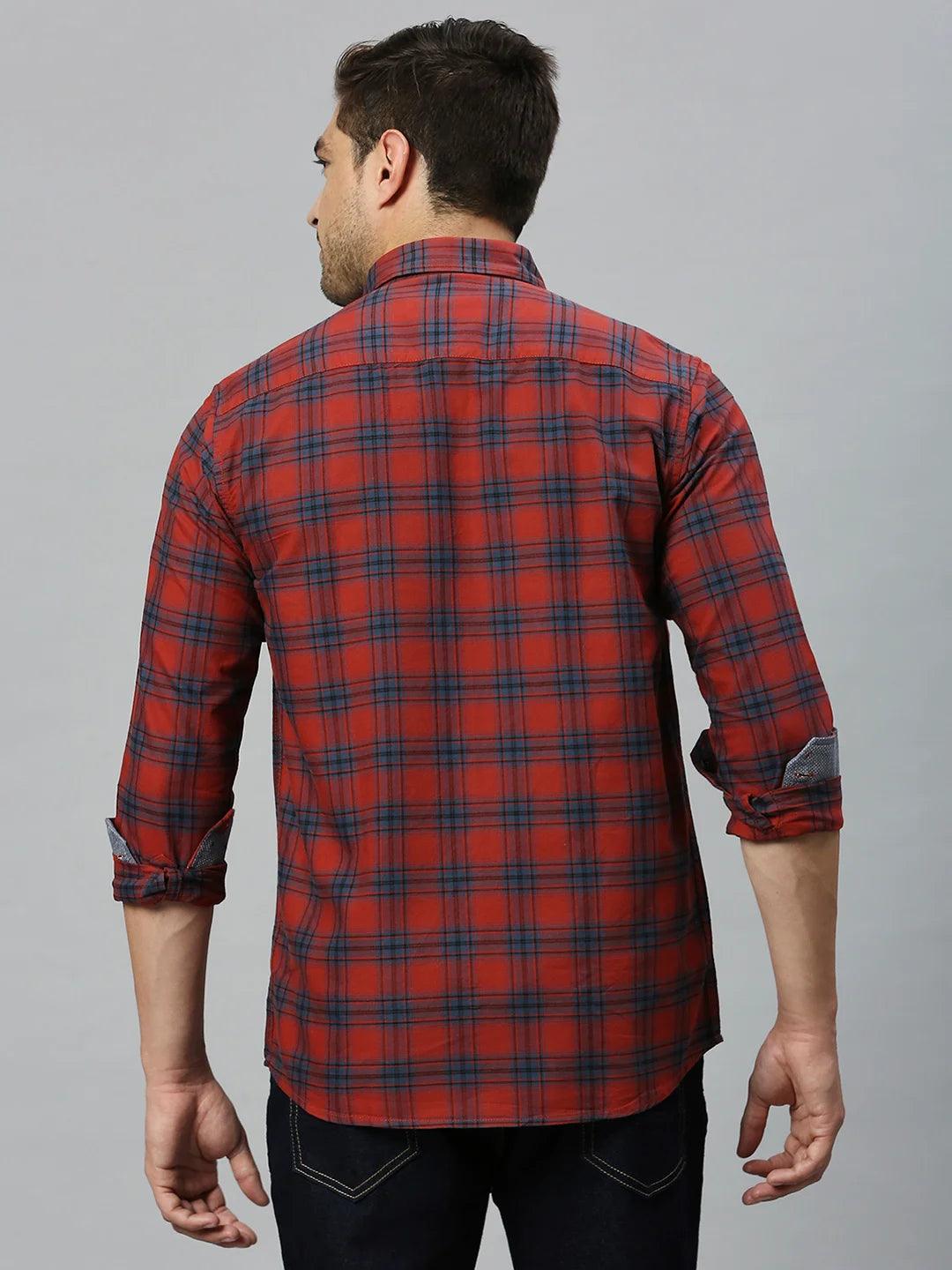 Checked opaque casual shirt has a spread collar, button placket, long regular sleeves, curved hem.
