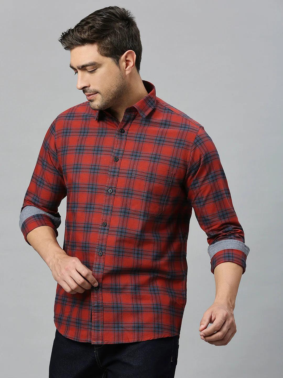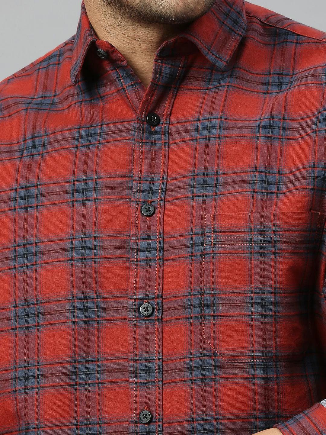 Checked opaque casual shirt has a spread collar, button placket, long regular sleeves, curved hem.