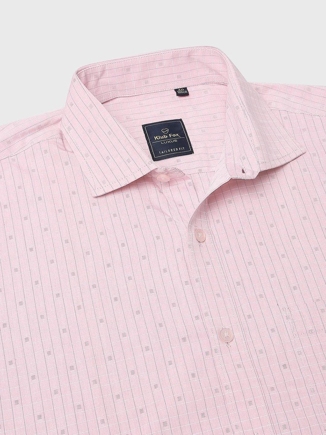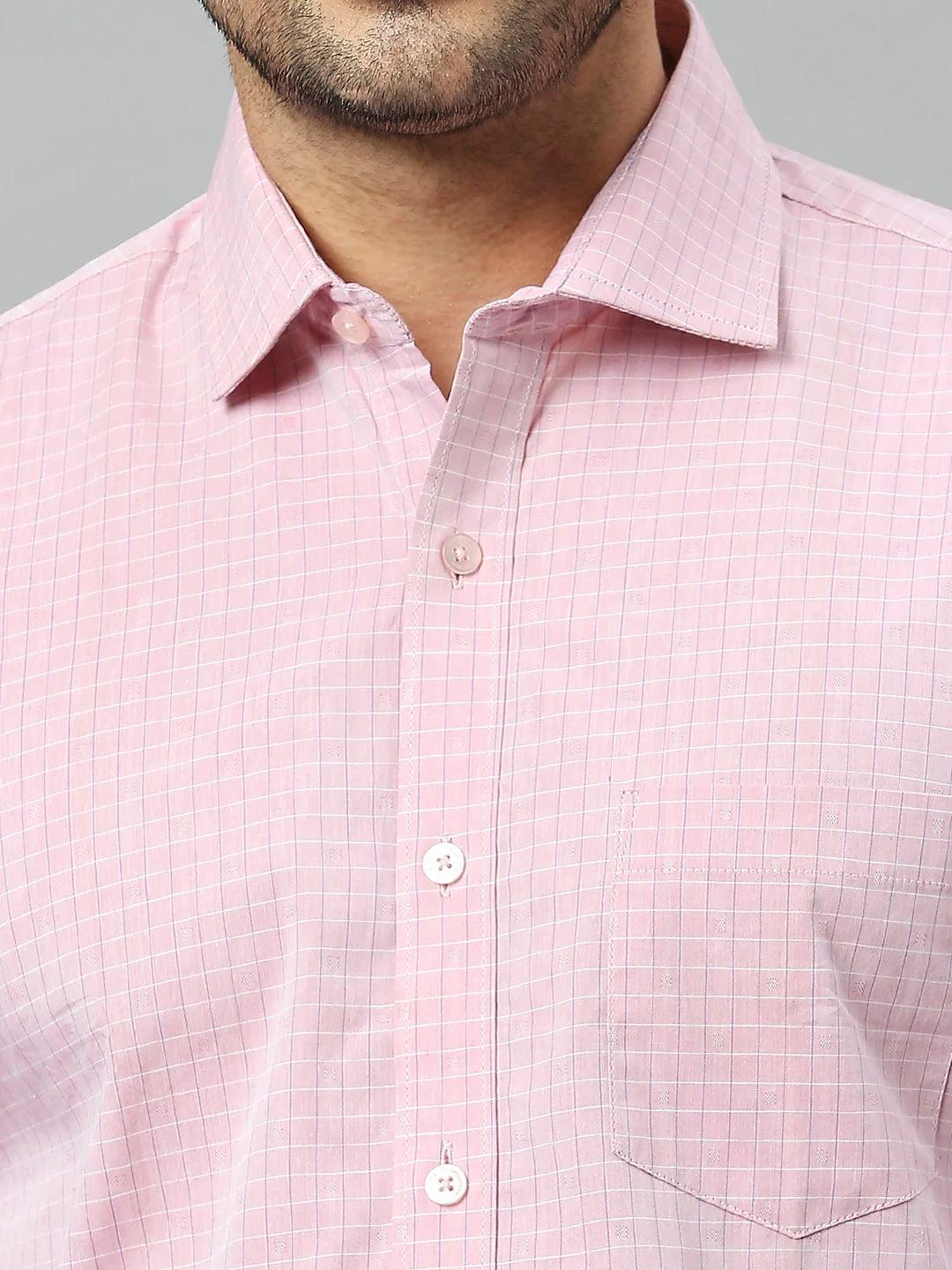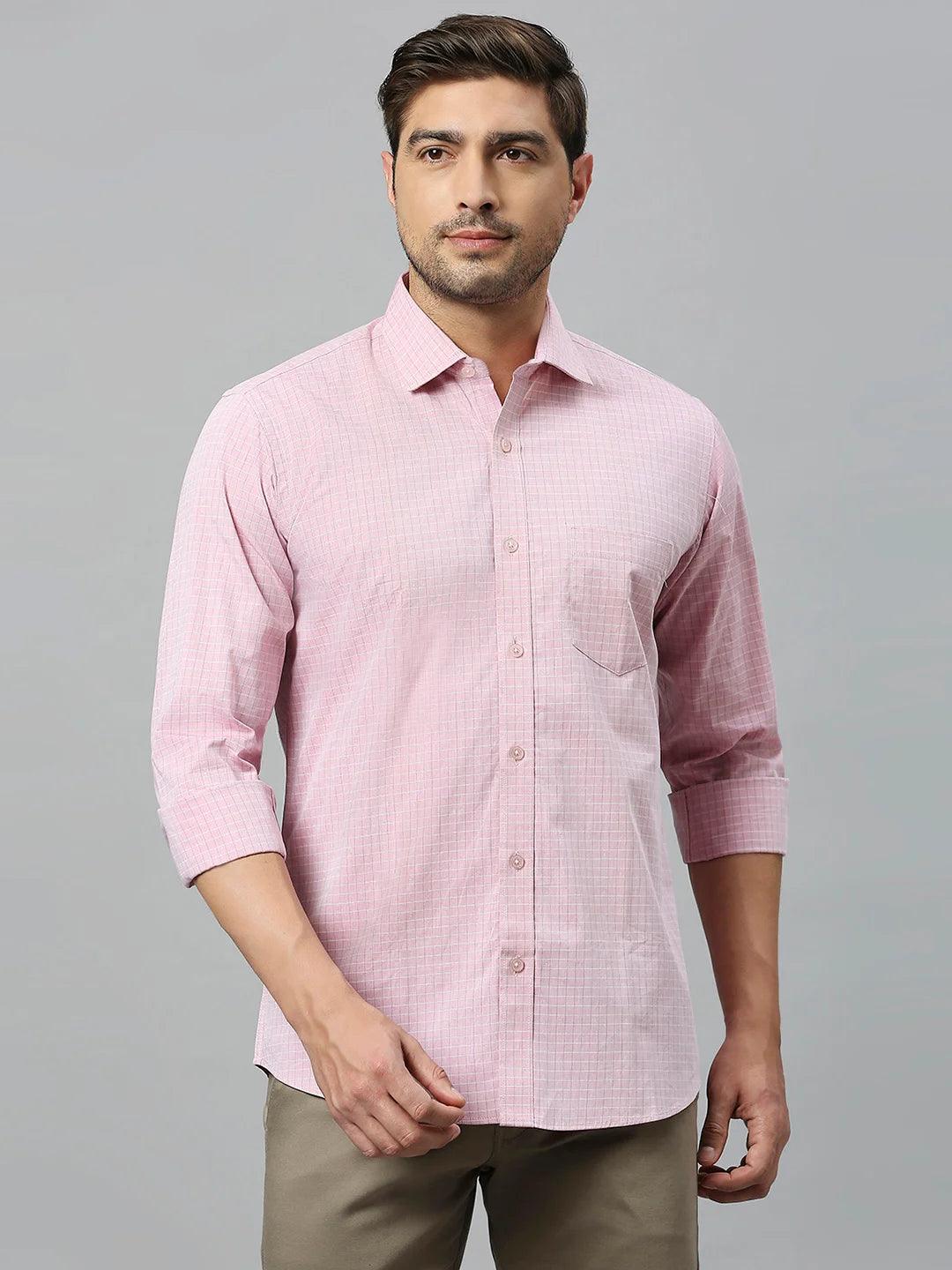 Checked opaque formal shirt has a spread collar, button placket, long regular sleeves, curved hem.