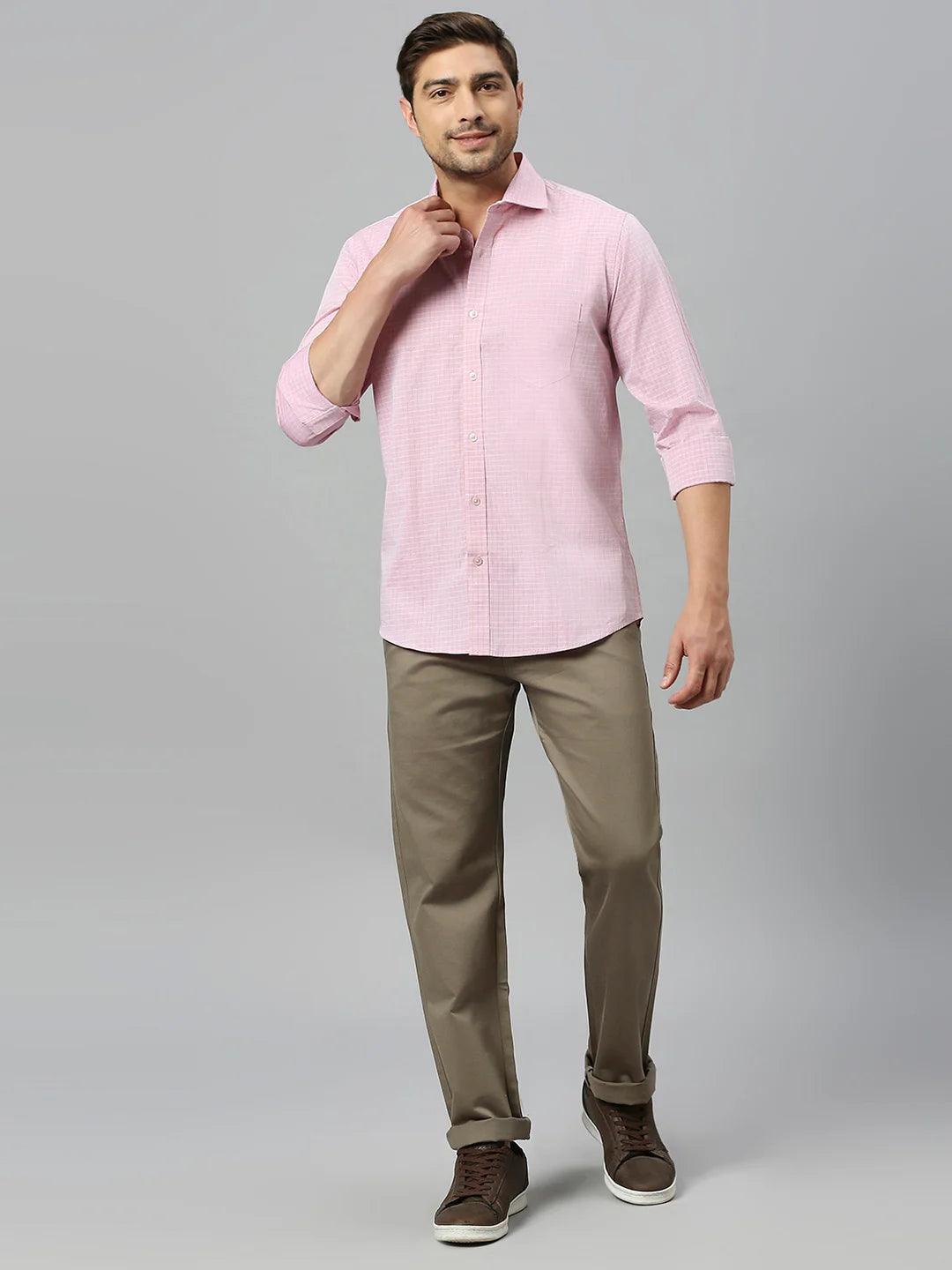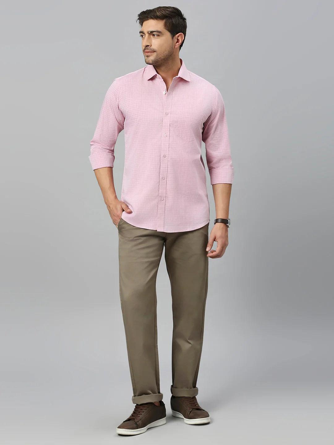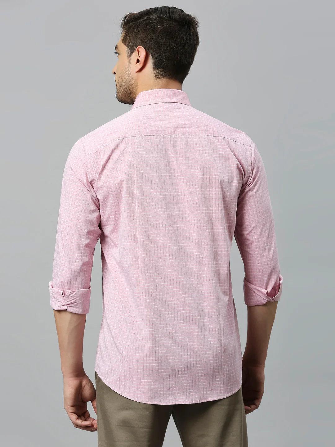 Checked opaque formal shirt has a spread collar, button placket, long regular sleeves, curved hem.