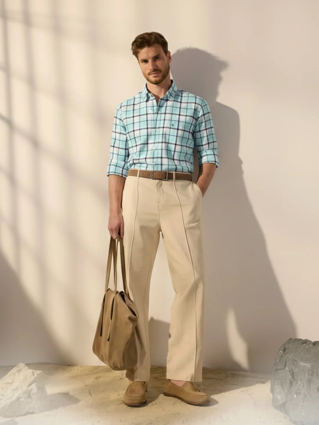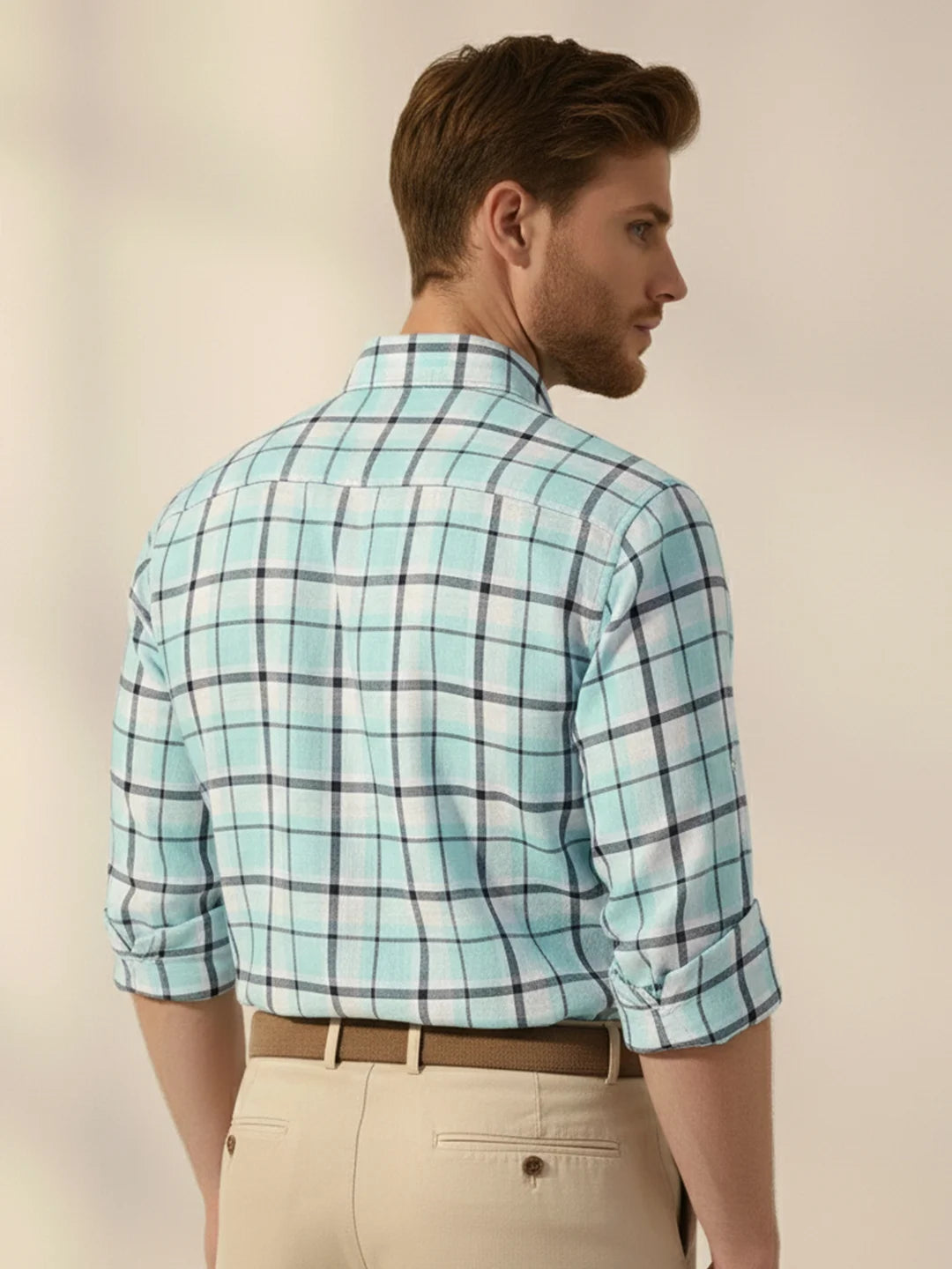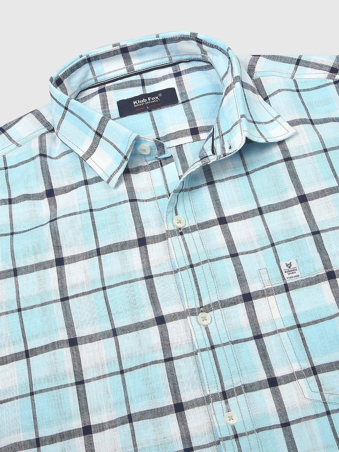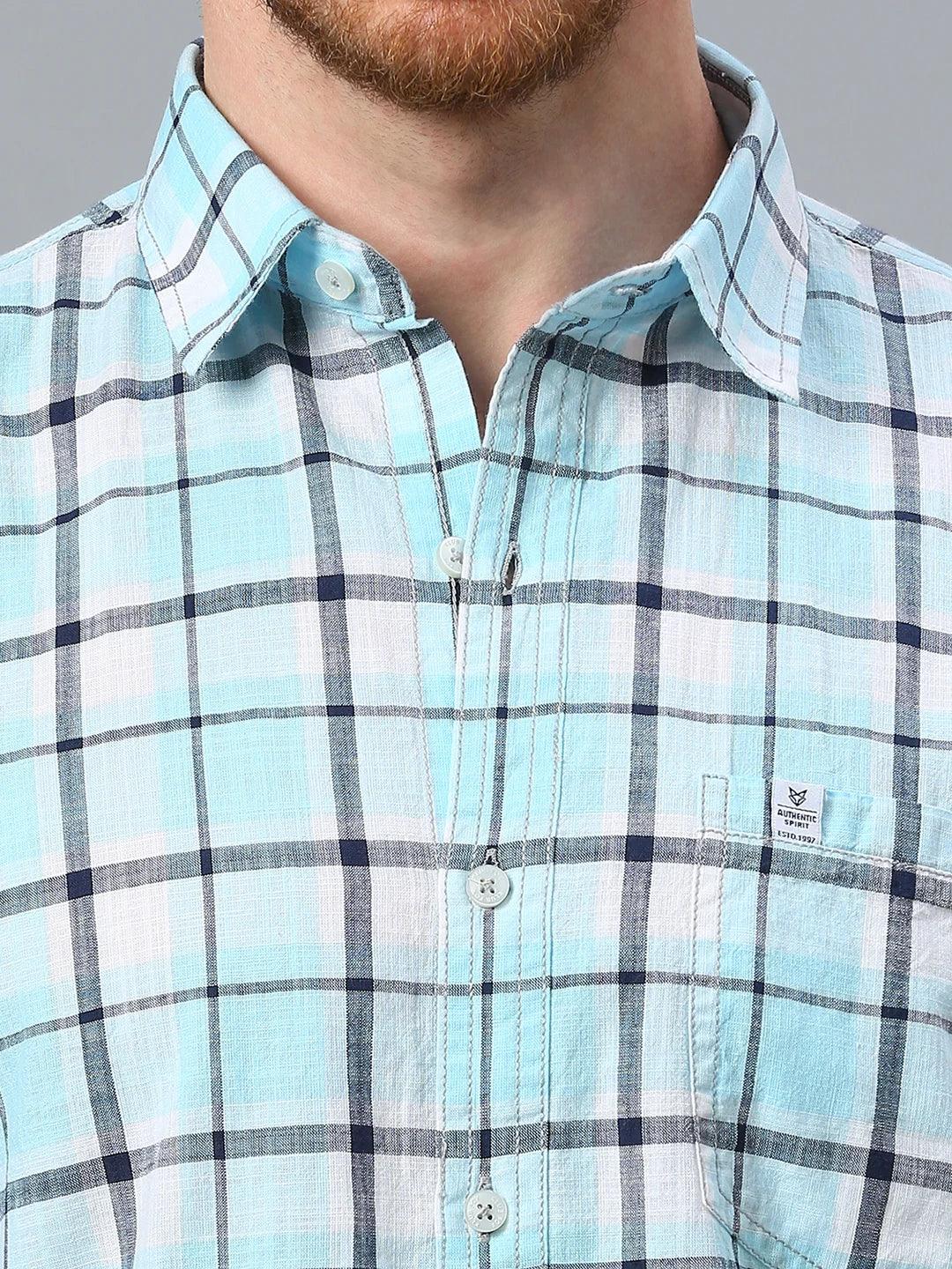 Checked opaque casual shirt has a spread collar, button plac ket, short regular sleeves, curved hem.
