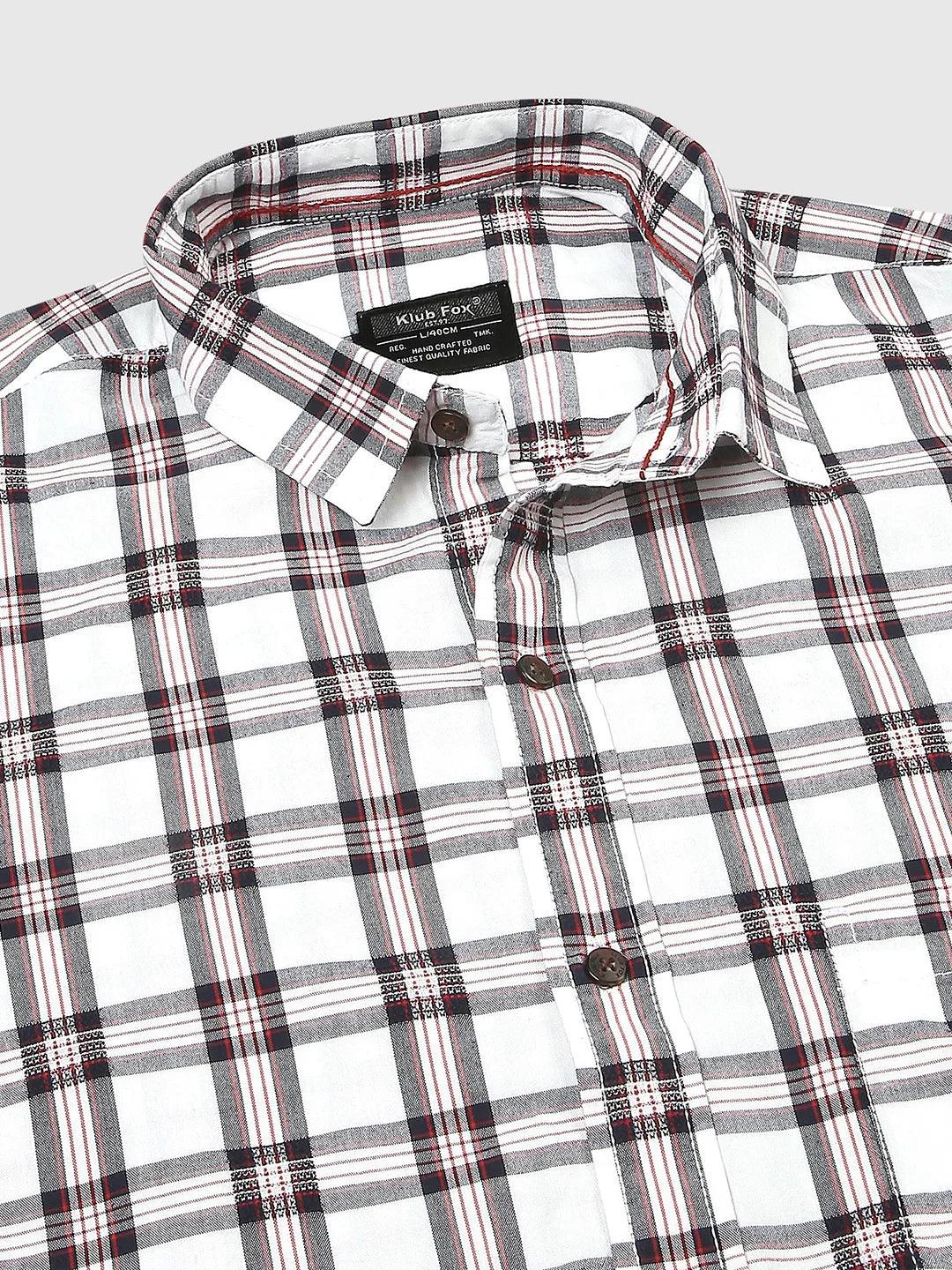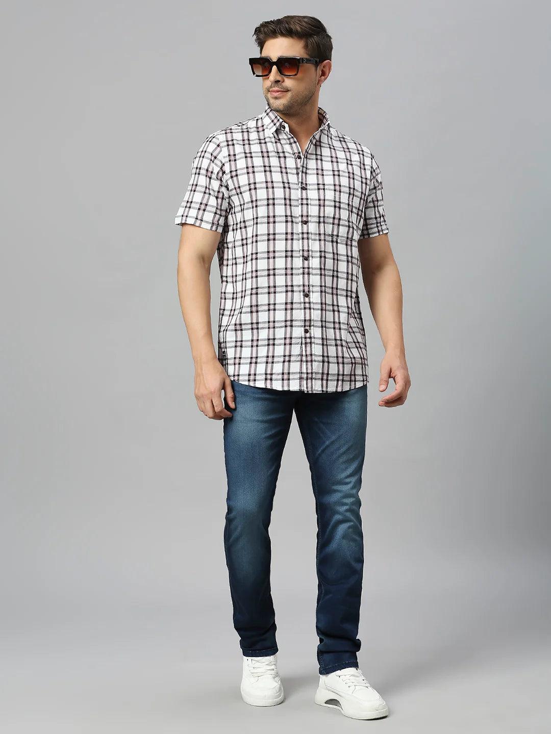 Checked opaque casual shirt has a spread collar, button placket, short regular sleeves, curved hem.